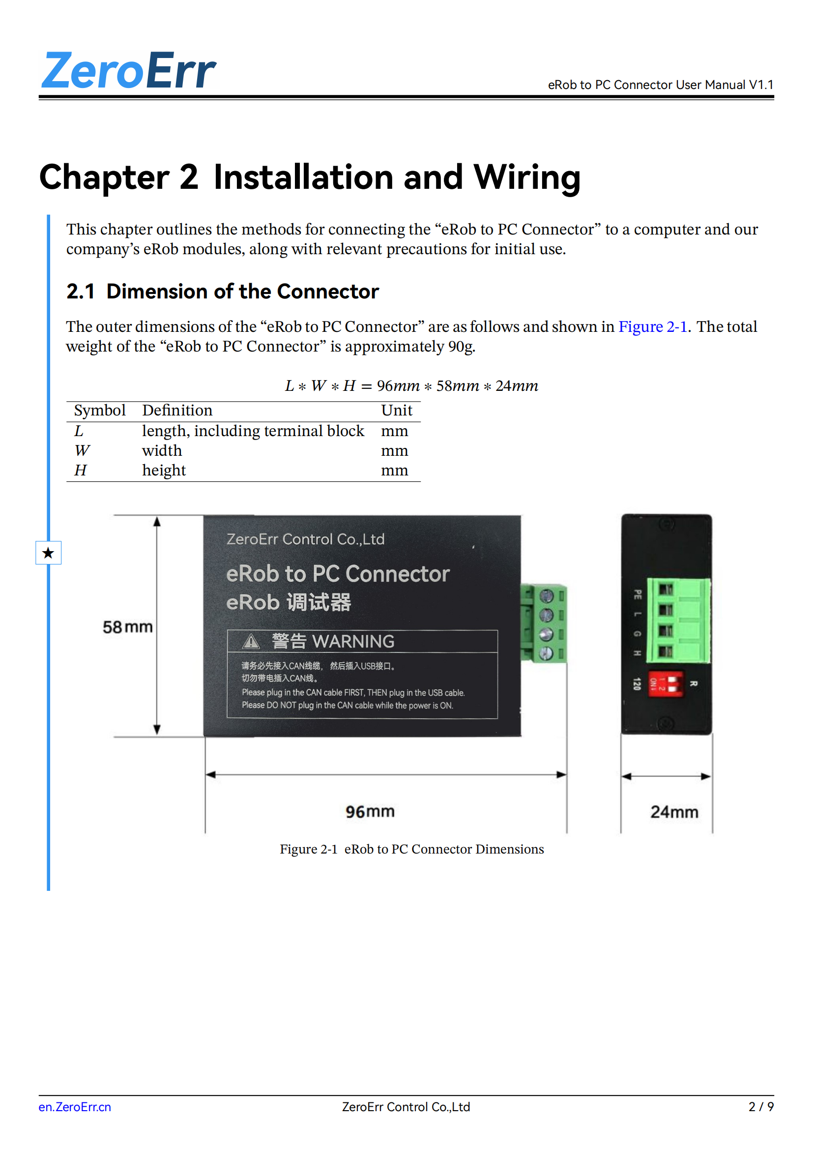 In Chapter 2, include the device's dimensions and interface definitions. Also, improve the device indicator light instructions and wiring precautions.