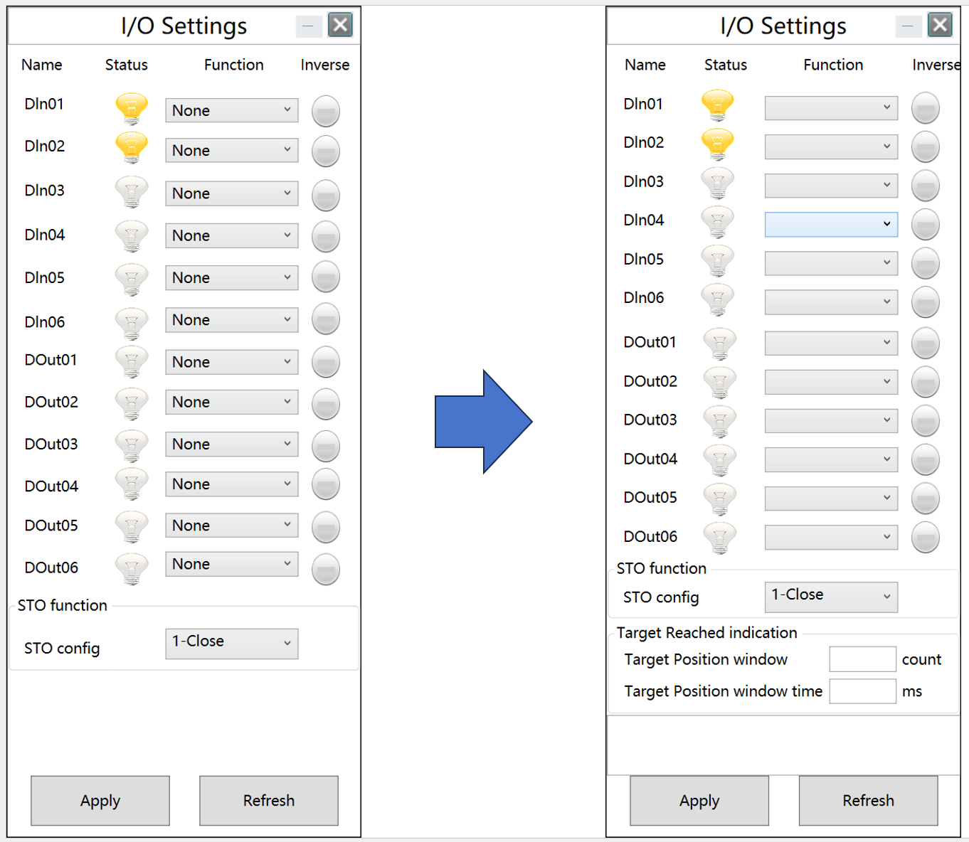 New Feature: In the "I/O Settings" interface, the read and write functions for the "Target Position window" and "Target Position window time" parameters have been enabled.