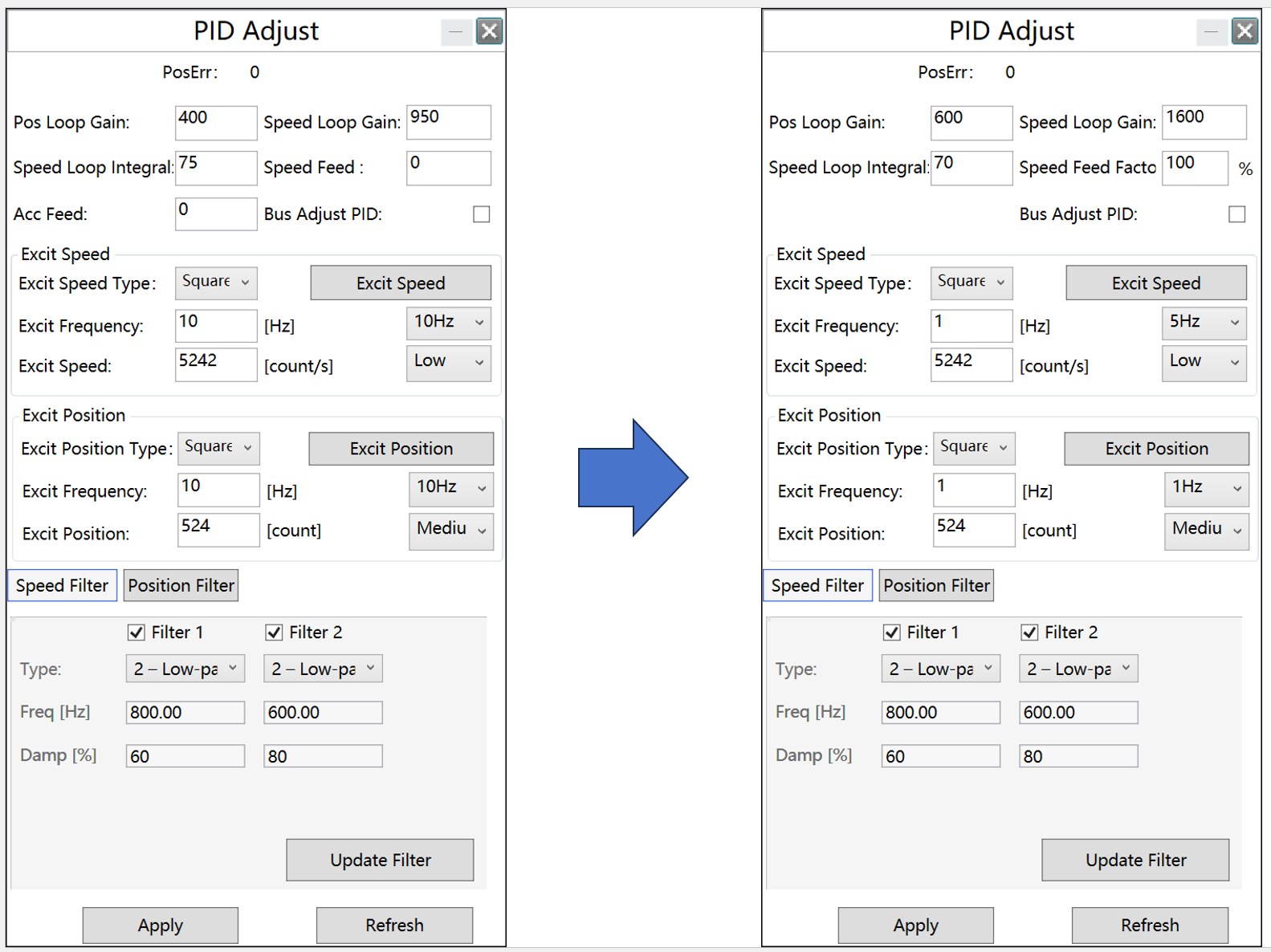 Optimization: In the "PID Tuning" interface, the "Speed Feed" and "Acc Feed" parameters are now disabled, and the read and write functions for the "Speed Feed Factor" parameter have been added to accommodate the new firmware.